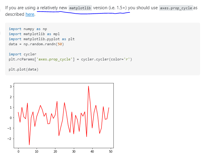 I am not able to change default color from blue to red using plt.rc() or mpl.rcparams According to Matplotlib's official documentation Here is the code I tried: import numpy as np import matplotl...