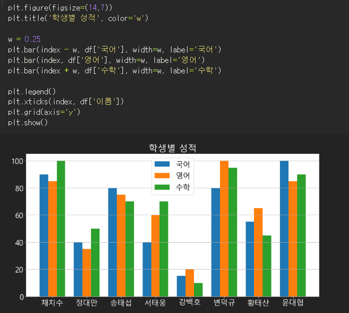plt.bar(index - w, df['국어'], width=w, label='국어')