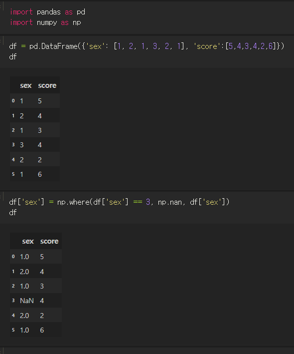 df['sex'] = np.where(df['sex'] == 3, np.nan, df['sex'])