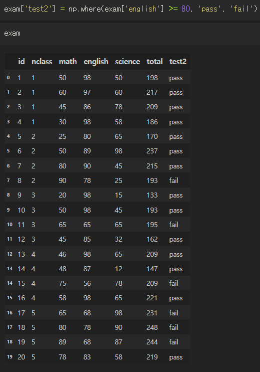 exam['test2'] = np.where(exam['english'] >= 80, 'pass', 'fail')
