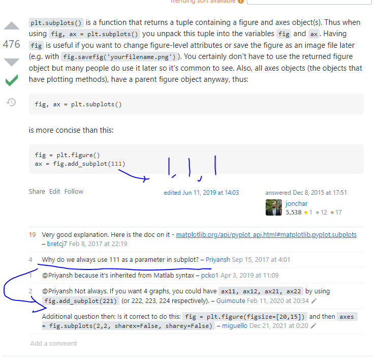 I'm learning to use matplotlib by studying examples, and a lot of examples seem to include a line like the following before creating a single plot... fig, ax = plt.subplots() Here are some exampl...
