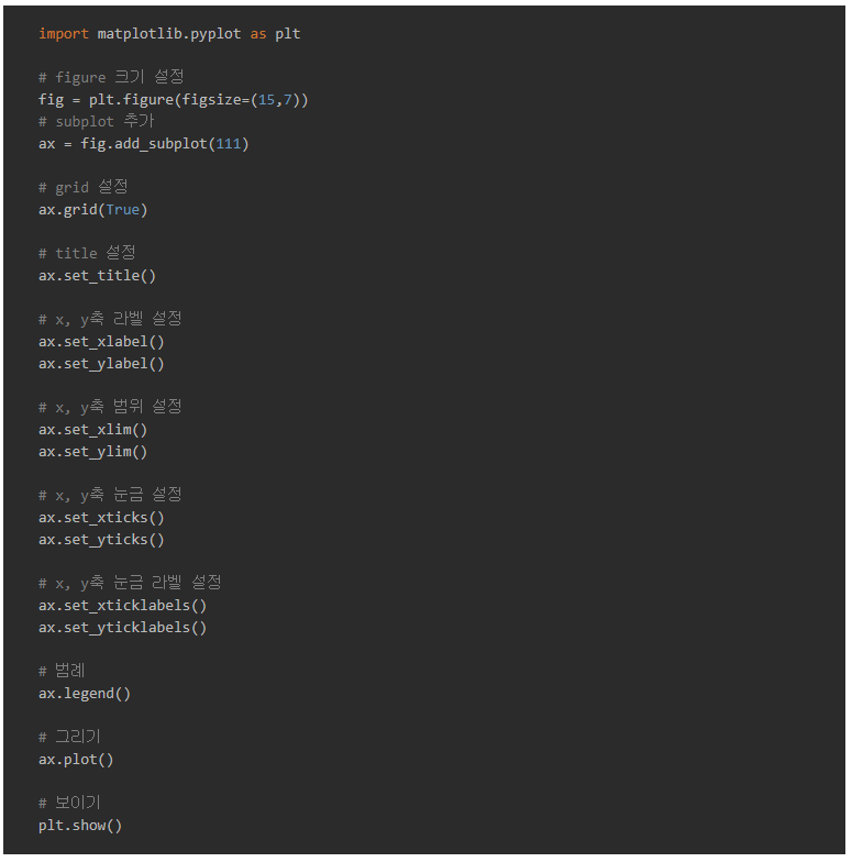 matplotlib.pyplot.figure reference https://matplotlib.org/3.1.1/api/_as_gen/matplotlib.pyplot.html example import matplotlib.pyplot as plt # figure 크기 설정 plt.figure(figsize=(15,7)) # grid 설정 p..