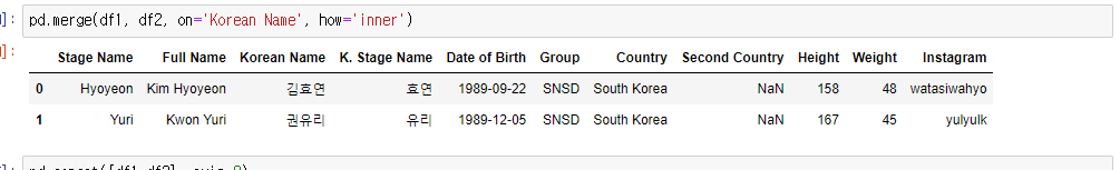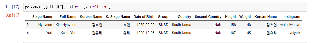 concat은 단순히 합치는거라서 겹치는 column('Korean Name')이 생긴다. 밑에보면 Korean Name이 2개