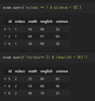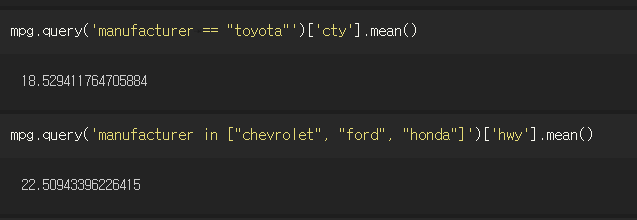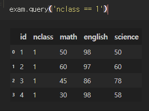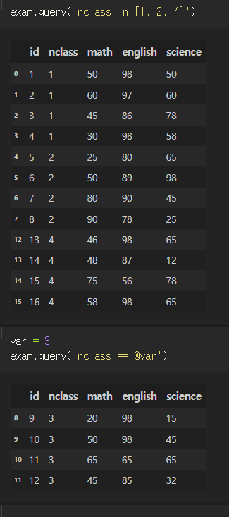 in을 사용할 수도 있고, DataFrame 외 변수를 사용할땐 @ 사용