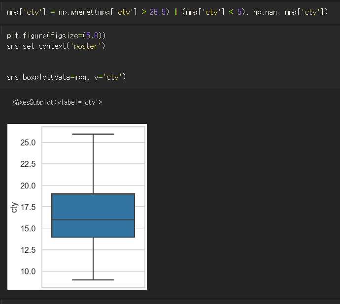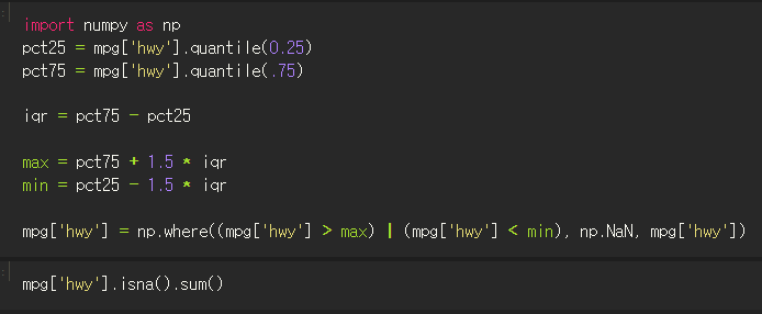 mpg['hwy'] = np.where((mpg['hwy'] > max) | (mpg['hwy'] < min), np.NaN, mpg['hwy'])