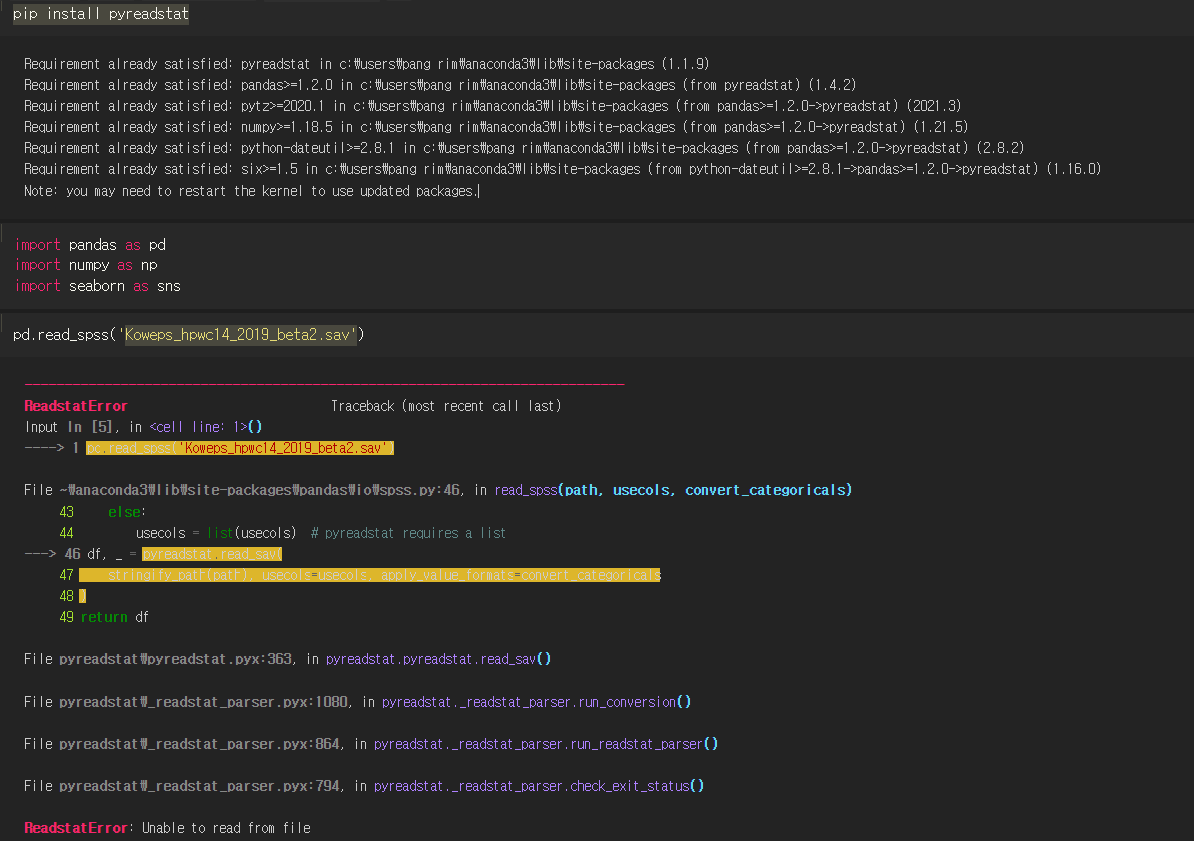 책에서 시키는대로하고, 아나콘다 프롬프트에서 해야되나 싶어서 아나콘다 프롬프트로도 했는데도 못읽음.