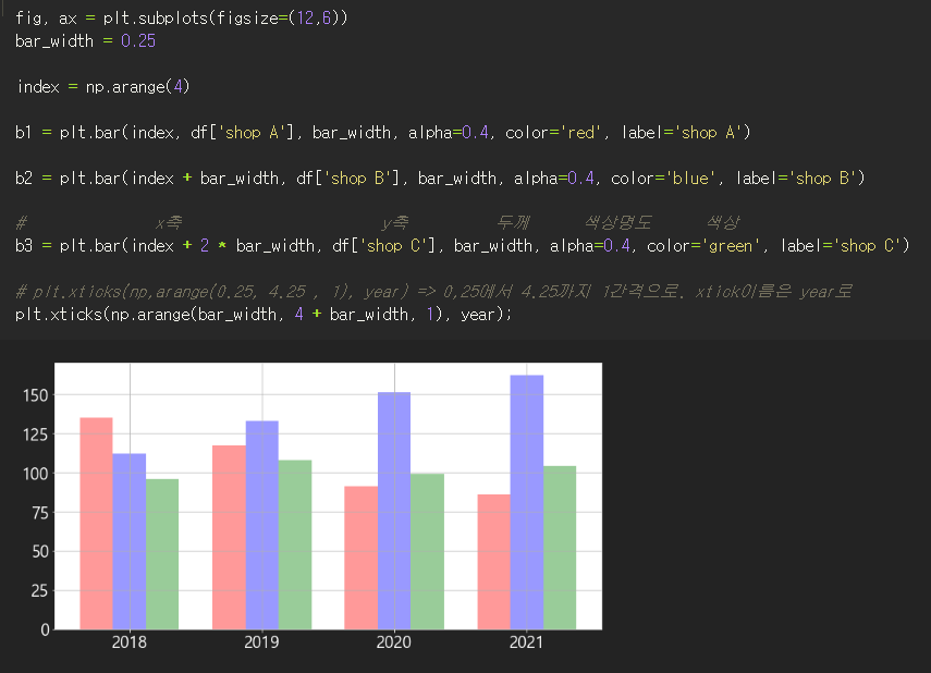 이번 글에서는 파이썬에서 다중 막대 그래프를 겹치지 않게 그리는 예제 코드를 살펴보도록 하겠습니다. 파이썬 plt 다중 막대 그래프 예제 코드 먼저, 다음과 같은 간단한 연도별 상점별 판매
