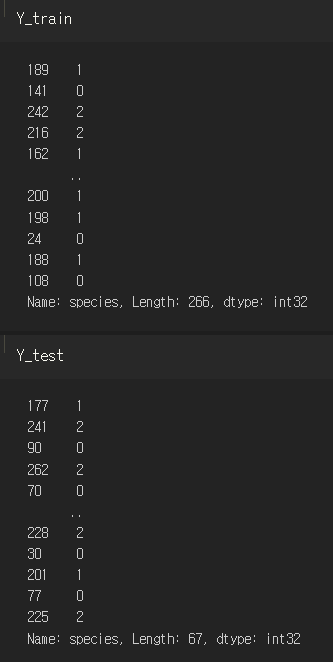 X에는 종빼고 나머지 데이터를, Y에는 종만 있는 결과데이터를 넣어준다.