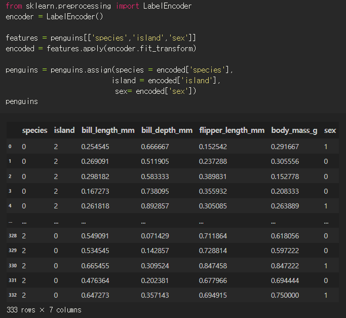| sklearn : 분류분석모델링 - 펭귄 종 맞추기 vs 성별 맞추기 (0) | 2022.10.19 |