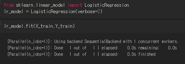 아래처럼 lr_model.fit(X_train, Y_train) 명령어를 입력하면 학습을 시작한다