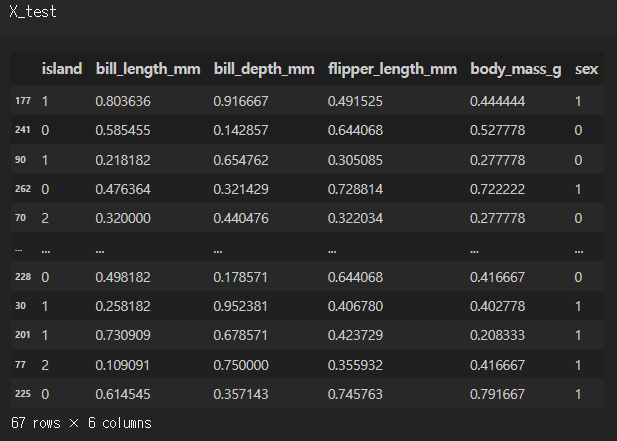테스트의 첫번째 행은 Chinstrap, 두번째는 Gentoo, 세번째는 Adelie.. 이런식으로 컴퓨터가 문제를 풀었는데 실제로 맞을까?