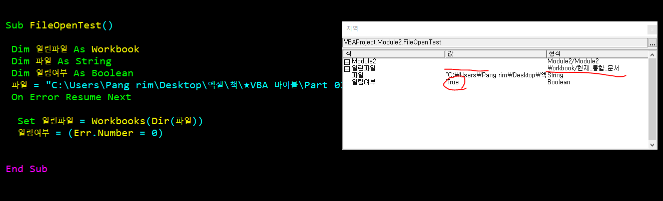 → 열린파일이라는 변수에 Workbooks 개체가 맞게 들어감