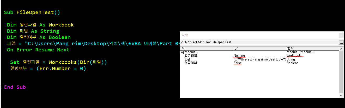 → 열린파일이라는 변수에 Workbooks 개체가 안 들어감 [★밑에설명]