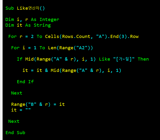 | VBA Like 연산자 활용 (추가) (0) | 2024.05.17 |