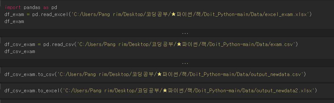 df_csv_exam = pd.read_csv('C:/Users/Pang rim/Desktop/코딩공부/★파이썬/책/Doit_Python-main/Data/exam.csv')