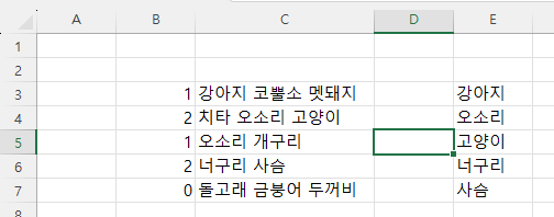 E열은 동물리스트고, C열에는 저렇게 동물들이 한 셀에 있다.