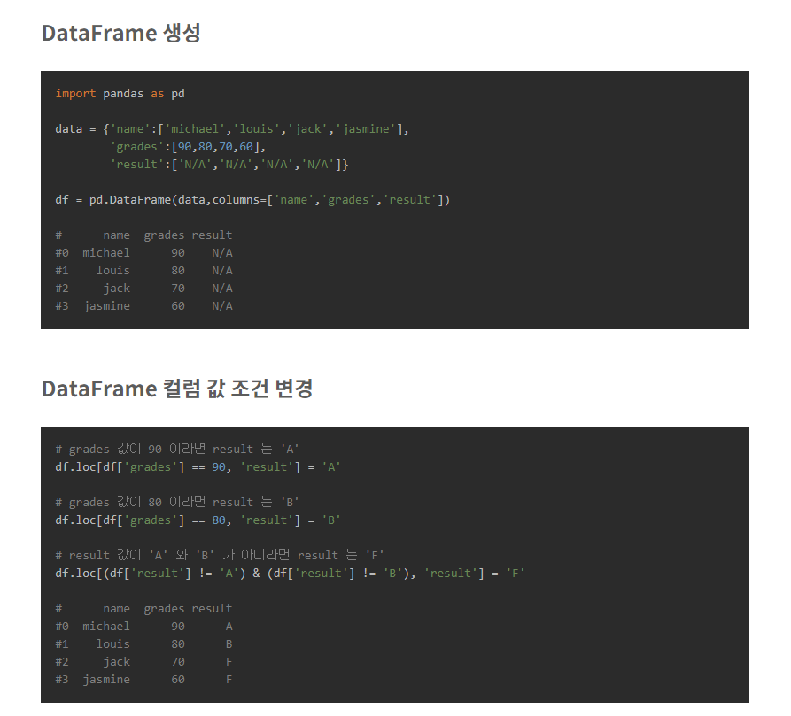 DataFrame 생성 import pandas as pd data = {'name':['michael','louis','jack','jasmine'], 'grades':[90,80,70,60], 'result':['N/A','N/A','N/A','N/A']} df = pd.DataFrame(data,columns=['name','grades','result']) # name grades result #0 michael 90 N/A #1 louis