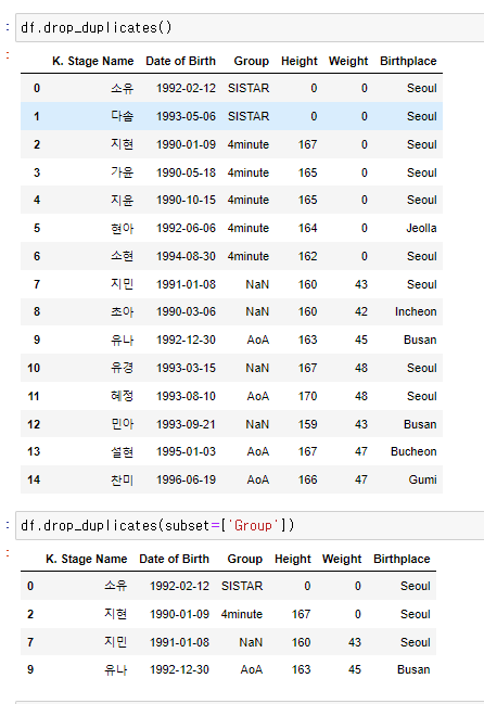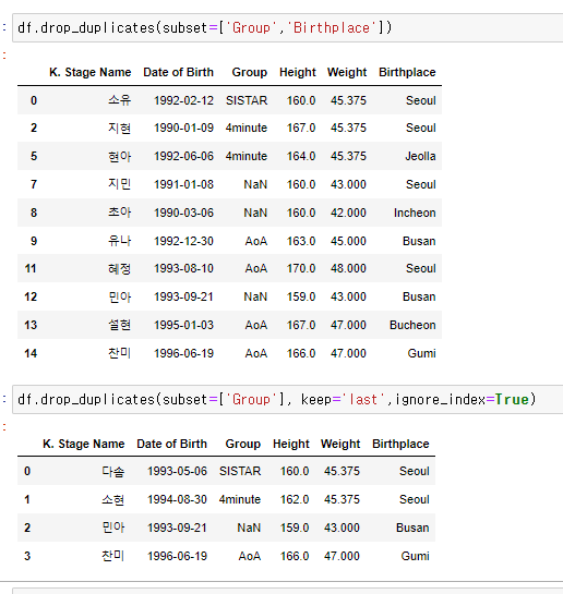 duplicates ==> DataFrame을 제거하여 DataFrame을 내뱉는다. 옵션은 subset, keep, inplace, ignore_index있다.