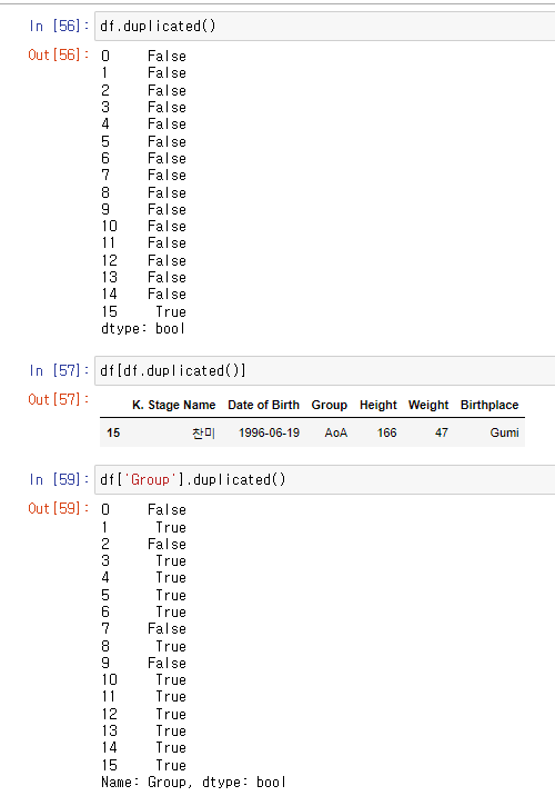 duplicated => Boolean형식의 Series를 내뱉는다. 중복값있는지 확인하는 용도