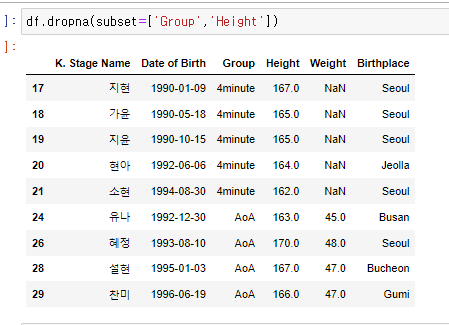 subset으로 column을 지정해주면, 해당 column의 NaN이 있을시에 행을 지워준다.