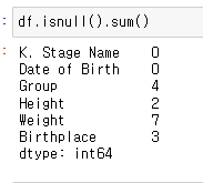 df.isnull().sum() : isnull은 sum이랑 같이 써서 column별로 결측값이 몇개있는지를 파악할 수 있다.
