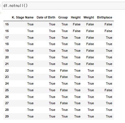notnull : isnull과 반대 결측값이 있으면 False를 내보낸다