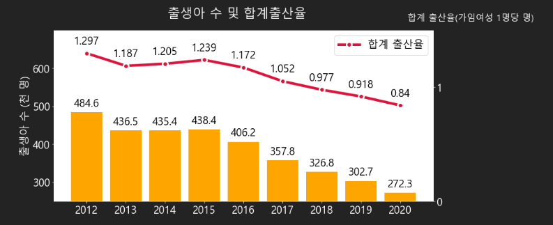 fig.suptitle('출생아 수 및 합계출산율', color='w')